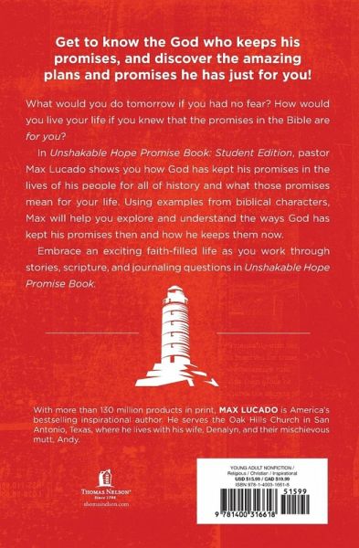 Get to know the God who keeps His promises. Unshakable Hope Promise Book, by bestselling author Max Lucado, explores the promises God made to His people throughout the Bible and how they are relevant to your life today. Get ready to discover the amazing plans and promises God has just for you! What would you do tomorrow if you had no fear? How would you live your life if you knew that the promises in the Bible are for you? What if God Himself put promises there meant for you and has an amazing plan for your life? In Unshakable Hope Promise Book: Student Edition, Max Lucado shows you how God has kept His promises in the lives of His people for all of history. Using examples from biblical characters and current examples from teens like you, Max will help you explore and understand the ways God has kept His promises then and how He keeps them now. Embrace an exciting faith-filled life as you work through stories, Scripture, and journaling questions in Unshakable Hope Promise Book.