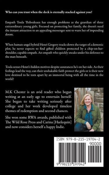 Who can you trust when the deck is eternally stacked against you? Empath Toula Thibodeaux has enough problems as the guardian of three extraordinary young girls. Focused on protecting her family, she doesn't need the instant attraction to an appealing messenger sent to warn her of impending doom. When human-angel hybrid Henri Gregory tracks down the target of a demonic plot, he never expects to find gifted children protected by a chip-on-her-shoulder, capable empath. An empath who quickly sneaks under his defenses to the man beneath. Toula senses Henri's hidden motives despite assurances he's on her side. As their feelings lead the way, can their unshakable faith protect the girls or is their new love destined to be torn apart by an immortal being with all the time in the world?