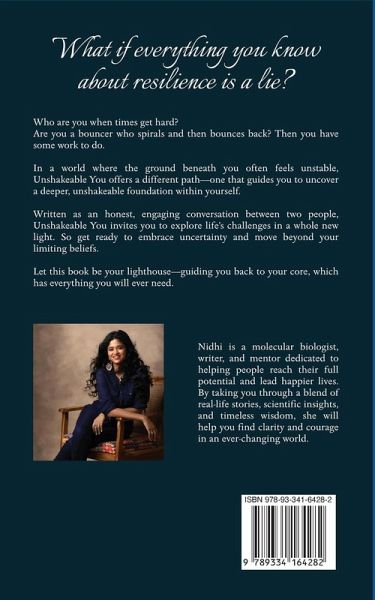 What if you could remain calm during a storm? What if you found a book that would make you laugh, cry, think, and feel loved all at once? Unshakeable You is one such book that will take you on a journey you will never forget, as it is unlikely that you will stay the same after reading it. Amid mounting concerns about the unpredictability of work and our future, learn how to turn the tides in your favor by fine-tuning your mind. Who are you when times get hard? Are you a bouncer who spirals and then bounces back? Then you have some work to do. It's not just the rising inflation we need to worry about, it is the overthinking and anxiety that have taken our minds hostage. In a world where the ground beneath you often feels unstable, Unshakeable You offers a different path -one that guides you to uncover a deeper, unshakeable foundation within yourself. Disclaimer: This book will challenge your existing beliefs and push you. That's the point. It is meant to, as rebuilding your beliefs is the catalyst of change you need to be happy. You can't reach another shore without leaving the one you are on. To be honest, you don't need to read a book if you want common advice that is good enough but short-lived, Google or ChatGPT would suffice. However, this book is meant to take you steps ahead to bring a more lasting change in your mind. So is it for everyone? No. It's for those who are willing to let go of old stubborn beliefs that keep us stuck in a cycle of self-sabotage and steal our happiness. This is not just another motivational self-help book, it is the kick and guidance you need to start valuing what matters the most and making life work for you. Written as an honest, engaging conversation between two people, Unshakeable You invites you to explore life's challenges in a whole new light. So get ready to embrace uncertainty with happiness and move beyond your limiting beliefs as you read these true stories, facts, and psychological techniques to break free. Let this powerful book be your lighthouse-guiding you back to your core, which has everything you will ever need.