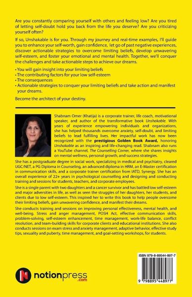 Are you constantly comparing yourself with others and feeling low? Are you tired of letting self-doubt hold you back from the life you deserve? Are you criticizing yourself often? If so, Unshakable is for you. Through my journey and real-time examples, I'll guide you to enhance your self-worth, gain confidence, let go of past negative experiences, discover actionable strategies to overcome limiting beliefs, develop unwavering self-esteem, and foster your emotional and mental health. Together, we'll conquer the challenges and take actionable steps to achieve our dreams. - You will gain insight into your limiting beliefs - The contributing factors for your low self-esteem - The consequences - Actionable strategies to conquer your limiting beliefs and take action and manifest your dreams. Become the architect of your destiny.