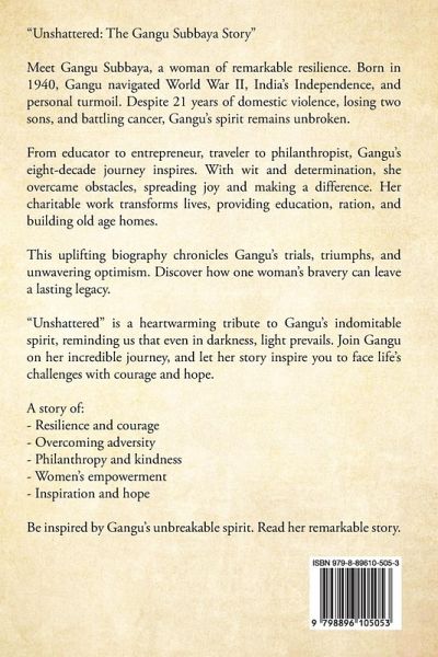 "Unshattered: The Gangu Subbaya Story" Meet Gangu Subbaya, a woman of remarkable resilience. Born in 1940, Gangu navigated World War II, India's Independence, and personal turmoil. Despite 21 years of domestic violence, losing two sons, and battling cancer, Gangu's spirit remains unbroken. From educator to entrepreneur, traveler to philanthropist, Gangu's eight-decade journey inspires. With wit and determination, she overcame obstacles, spreading joy and making a difference. Her charitable work transforms lives, providing education, ration, and building old age homes. This uplifting biography chronicles Gangu's trials, triumphs, and unwavering optimism. Discover how one woman's bravery can leave a lasting legacy. "Unshattered" is a heartwarming tribute to Gangu's indomitable spirit, reminding us that even in darkness, light prevails. Join Gangu on her incredible journey, and let her story inspire you to face life's challenges with courage and hope. A story of: - Resilience and courage - Overcoming adversity - Philanthropy and kindness - Women's empowerment - Inspiration and hope Be inspired by Gangu's unbreakable spirit. Read her remarkable story.