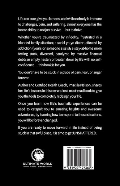 Life can sure give you lemons, and while nobody is immune to challenges, pain, and suffering, almost everyone has the innate ability to not just survive... but to thrive. Whether you're traumatized by infidelity; frustrated in a blended family situation; a serial yo-yo dieter; affected by addiction (yours or someone else's); a stay-at-home mom feeling stuck; divorced; paralyzed by massive financial debt; an empty nester; or beaten down by life with no self-confidence... this book is for you. You don't have to be stuck in a place of pain, fear, or anger forever. Author and Certified Health Coach, Priscilla Nelson, shares her life's lessons in this raw and real must-read book to give you the tools to completely redesign your life. Once you learn how life's traumatic experiences can be used to catapult you to amazing heights and awesome adventures, by learning how to respond to those situations, you will be forever changed. If you are ready to move forward in life instead of being stuck in that awful place, it is time to get UNSHATTERED.