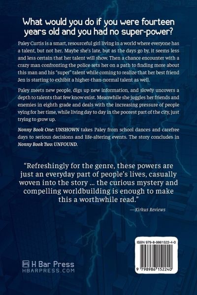 What would you do if you were fourteen years old and you had no super-power? Paley Curtis is a smart, resourceful girl living in a world where everyone has a talent, but not her. Maybe she's late, but as the days go by, it seems less and less certain that her talent will show. Then a chance encounter with a crazy man confronting the police sets her on a path to finding more about this man and his "super" talent while coming to realize that her best friend Jen is starting to exhibit a higher-than-normal talent as well. Paley meets new people, digs up new information, and slowly uncovers a depth to talents that few know exist. Meanwhile she juggles her friends and enemies in eighth grade and deals with the increasing pressure of people vying for her time, while living day to day in the poorest part of the city, just trying to grow up. Nonny Book One: UNSHOWN takes Paley from school dances and carefree days to serious decisions and life-altering events. The story concludes in Nonny Book Two: UNFOUND.