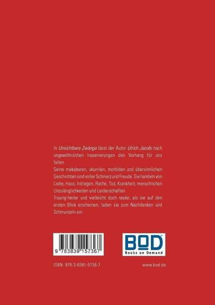 In Unsichtbare Zwänge läßt der Autor Ulrich Jacobi nach ungewöhnlichen Inszenierungen den Vorhang für uns fallen.Seine makaberen, skurrilen, morbiden und übersinnlichen Geschichten sind voller Schmerz und Freude. Sie handeln von Liebe, Hass, Intriegen, Rache, Tod, Krankheit, menschlichen Unzulänglichkeiten und Leidenschaften.Traurig-heiter und vielleicht doch realer, als sie auf den ersten Blick erscheinen, laden sie zum Nachdenken und Schmunzeln ein.