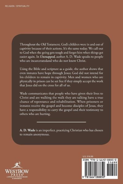 Throughout the Old Testament, God's children were in and out of captivity because of their actions. It's the same today. We call out to God when the going gets tough and forget him when things get easier again. In Unsnapped, author A. D. Wade speaks to people who are incarceratedand who do not know Christ. Using the Bible and scripture as a guide, the author shows that even inmates have hope through Jesus; God did not intend for his children to remain in captivity. Men and women who are physically in prison can be set free if they simply accept the work that Jesus did on the cross for all of us. Wade communicates that people who have given their lives to Christ and are walking the walk they are talking have a true chance of repentance and rehabilitation. When prisoners or inmates receive the gospel and become disciples of Jesus, they have a responsibility to carry the gospel and their testimony to others who are hurting.