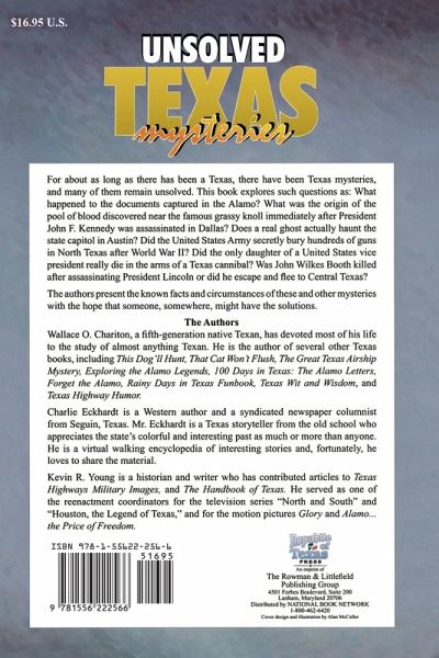 For about as long as there has been a Texas there have been Texas mysteries, and many of them remain unsolved. What happened to the documents captured in the Alamo? Does a ghost actually haunt the state capitol in Austin? Did the U.S. Army secretly bury hundreds of guns in North Texas after WWII? Was John Wilkes Booth killed or did he escape and flee to Central Texas? The authors present the known facts and circumstances of these and other mysteries.