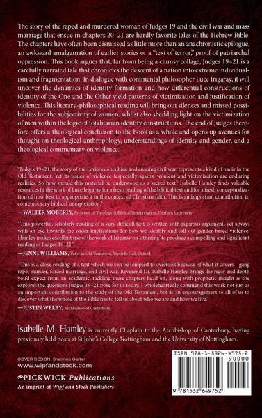 The story of the raped and murdered woman of Judges 19 and the civil war and mass marriage that ensue in chapters 20-21 are hardly favorite tales of the Hebrew Bible. The chapters have often been dismissed as little more than an anachronistic epilogue, an awkward amalgamation of earlier stories or a ""text of terror,"" proof of patriarchal oppression. This book argues that, far from being a clumsy collage, Judges 19-21 is a carefully narrated tale that chronicles the descent of a nation into extreme individualism and fragmentation. In dialogue with continental philosopher Luce Irigaray, it will uncover the dynamics of identity formation and how differential constructions of identity of the One and the Other yield patterns of victimization and justification of violence. This literary-philosophical reading will bring out silences and missed possibilities for the subjectivity of women, whilst also shedding light on the victimization of men within the logic of totalitarian identity constructions. The end of Judges therefore offers a theological conclusion to the book as a whole and opens up avenues for thought on theological anthropology, understandings of identity and gender, and a theological commentary on violence. ""Judges 19-21, the story of the Levite's concubine and ensuing civil war, represents a kind of nadir in the Old Testament. Yet its issues of violence (especially against women) and victimization are enduring realities. So how should this material be understood as a sacred text? Isabelle Hamley finds valuable resources in the work of Luce Irigaray for a fresh reading of the biblical text and for a fresh conceptualization of how best to appropriate it in the context of Christian faith. This is an important contribution to contemporary biblical interpretation."" --Walter Moberly, Professor of Theology & Biblical Interpretation, Durham University. ""This powerful, scholarly reading of a very difficult text is written with rigorous argument, yet always with an eye towards the wider implications for how we identify and call out gender-based violence. Hamley makes excellent use of the work of Irigaray on 'othering' to produce a compelling and significant reading of Judges 19-21."" --Jenni Williams, Tutor in Old Testament, Wycliffe Hall, Oxford ""This is a close reading of a text which we can be tempted to overlook because of what it covers--gang rape, murder, forced marriage, and civil war. Reverend Dr. Isabelle Hamley brings the rigor and depth you'd expect from an academic, tackling these chapters head on, along with prophetic insight as she explores the questions Judges 19-21 pose for us today. I wholeheartedly commend this work not just as an important contribution to the study of the Old Testament, but as an encouragement to all of us to discover what the whole of the Bible has to tell us about who we are and how we live."" --Justin Welby, Archbishop of Canterbury Isabelle M. Hamley is currently Chaplain to the Archbishop of Canterbury, having previously held posts at St John's College Nottingham and the University of Nottingham.