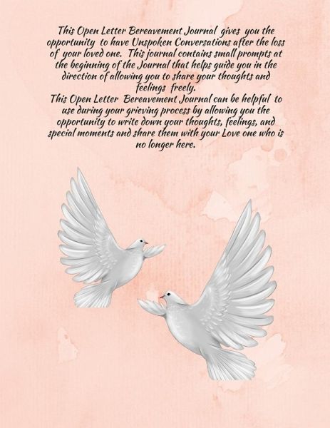 This Open Letter Bereavement Journal gives you the opportunity to have Unspoken Conversations after the loss of your loved one. This journal contains small prompts at the beginning of the Journal that helps guide you in the direction of allowing you to share your thoughts and feelings freely. This Open Letter Bereavement Journal can be helpful to use during your grieving process by allowing you the opportunity to write down your thoughts, feelings, and special moments and share them with your Love one who is no longer here.
