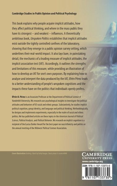 This book explains why people acquire implicit attitudes, how they affect political thinking, and where in the mass public they have their strongest - and weakest - influences. A theoretically ambitious book, Unspoken Politics establishes that implicit attitudes exist outside the tightly controlled confines of the laboratory, showing that they emerge in a public opinion survey setting, which underlines their real-world impact. It also lays bare, in painstaking detail, the mechanics of a leading measure of implicit attitudes, the implicit association test (IAT). Accordingly, it outlines the strengths and limitations of this measure, while providing an illustration of how to develop an IAT for one's own purposes. By explaining how to analyze and interpret the data produced by the IAT, this book leads to a better understanding of people's unspoken cognitions and the impacts these have on the politics that individuals openly profess.