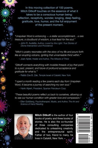 Unspoken Word: Love Longing & Letting Go is a "best of" collection of Mitch Ditkoff's poetry - his fourth book in an ongoing series. His poems are a kind of inner tuning fork, giving voice to the human quest for the divine, as well as the existential gap between our highest aspirations and the seeming mundane realities of daily life. Inspired by the poetry of Rumi, Hafiz, Kabir, and Rilke, Ditkoff's expressions of the heart serve as a bridge between two worlds - the timeless world of ecstatic experience and the all-too-common 9 to 5. Human beings tend to live their lives between these two polls, often gravitating to one over the other. What Ditkoff attempts to do in his poetry is honor all of it. To him, it's all holy, all sacred, all divine - even if it doesn't always seem that way. As he notes in The Only Pilgrimage Required: "Here's a little secret: every breath you take is a prayer, 22,000 times a day it rises, unannounced, then returns to who knows where, you do not need to kneel, you do not need to speak, and the only pilgrimage required is the one from head to heart, the one all people seek."