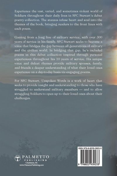 For Soldiers, veterans, counselors, and more comes a uniquely personal and relatable military poetry collection that addresses the complex lives Soldiers lead - from their experiences to emotions, trauma, patriotism, and valor. Experience the vast, varied, and sometimes violent world of Soldiers throughout their daily lives in SFC Stewart's debut poetry collection. The stanzas infuse heart and soul into the themes of the book, bringing readers to the front lines with each poem. Coming from a long line of military service, with over 300 years of service in his family, SFC Stewart seeks to become a voice that bridges the gap between all generations of military and the civilian world. In bridging that gap, he's included poems in this debut collection inspired through personal experiences throughout his 10 years of service. His unique voice and dulcet rhymes provide military spouses, family, and friends a deeper understanding of what their loved ones experience on a day-to-day basis via engaging poems. Above all, SFC Stewart hopes other Soldiers can recognize through this poetry anthology that they are not alone in their struggles. Written to encourage other Soldiers, enhance military family and friends' understanding of Soldier struggles, and express thoughts and feelings on paper, Unspoken Words makes a great bookshelf addition for: ● Current Soldiers. ● Behavioral health specialists. ● Military chaplains. ● Military family members. ● Veterans. ● Recruits. ● Individuals with behavioral health issues related to Post Traumatic Stress Disorder. ● Patriotic civilians who want to understand the world of the Soldier. For SFC Stewart, Unspoken Words is a work of heart that seeks to provide insight and understanding to those who have struggled to understand military members - and to allow struggling Soldiers to open up to their loved ones about their challenges.