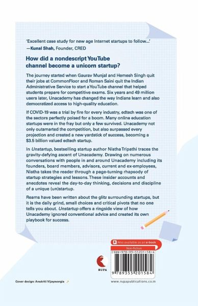 How did a nondescript YouTube channel become a unicorn startup? The journey started when Gaurav Munjal and Hemesh Singh quit their jobs at CommonFloor and Roman Saini quit the Indian Administrative Service to start a YouTube channel that helped students prepare for competitive exams. Six years and 49 million users later, Unacademy has changed the way Indians learn and also democratized access to high-quality education. If COVID-19 was a trial by fire for every industry, edtech was one of the sectors perfectly poised for a boom. Many online education startups were in the fray but only a few survived. Unacademy not only outsmarted the competition, but also surpassed every projection and created a new yardstick of success, becoming a $3.5 billion valued edtech startup. In Unstartup, bestselling startup author Nistha Tripathi traces the gravity-defying ascent of Unacademy. Drawing on numerous conversations with people in and around Unacademy including its founders, board members, advisors, current and ex-employees, Nistha takes the reader through a page-turning rhapsody of startup strategies and lessons. These insider accounts and anecdotes reveal the day-to-day thinking, decisions and discipline of a unique (un)startup. Reams have been written about the glitz surrounding startups, but it is the daily grind, small choices and critical pivots that no one tells you about. Unstartup offers a ringside view of how Unacademy ignored conventional advice and created its own playbook for success.