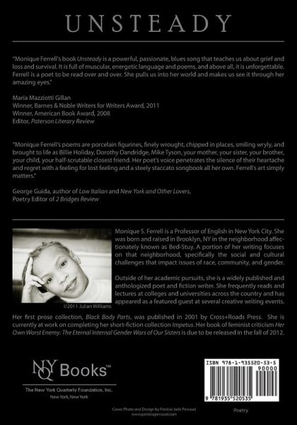 UNSTEADY, Monique Ferrell's first full-length collection of poetry and dramatic monologues, is an examination of a life in progress. The verse in this collection delves deeply into such themes as race, class, violence, gentrification, sexuality, celebrity, love, and politics. It is designed to explore the life issues of which we are all so certain, but hopes to express that uncertainty-being unsteady-is normal and can lend itself to deep reflection and creativity. In its pages, you will find poems about infamous cultural figures like Billie Holiday, Mike Tyson, and Tennessee Williams. Additionally, the reader will find poems about a mother who made a difficult and irrevocable decision during Hurricane Katrina, and about the late Lashaundra Armstrong-a woman who drove herself and her five children into the Hudson River during the winter of 2011. It is a visceral examination of things that matter to the writer, and in the end, after your own examination, things that will matter to you as well.