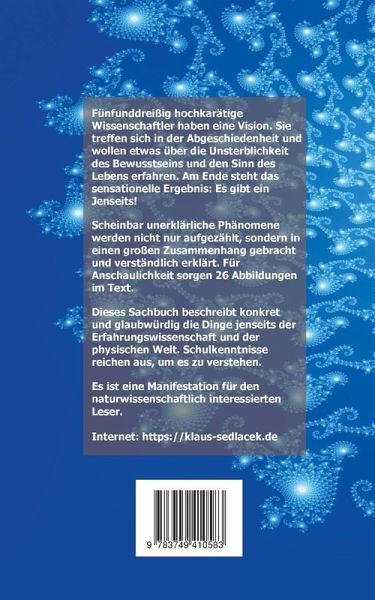 In diesem Buch geht es weder um Glauben noch um Esoterik, sondern um Beweise. Glaubwürdige, wissenschaftliche Beweise, die in eine Form gepackt sind, dass sie für jeden Interessierten verständlich, bzw. nachvollziehbar sind. Als Form der Darstellung dient eine Rahmenhandlung, in welcher der fiktive Professor Allman eine Lehrgangsveranstaltung für seine Kollegen abhält. Nach und nach entwickelt Professor Allman eine belastungsfähige wissenschaftliche Theorie. Es ist ungewöhnlich, wenn eine wissenschaftliche Arbeit aufgebaut ist wie ein Sachbuch und eine Rahmenhandlung benützt. Aber diese Arbeit hat auch einen ungewöhnlichen, uns alle betreffenden Inhalt. Der soll und darf nicht in den Büchereien der Fachwelt verstauben, sondern drängt nach dem Zugang zu einer breiten Öffentlichkeit.Wohl zum ersten Mal gelingt der Beweis, dass Bewusstsein außerhalb des Gehirns existiert.Das hat kaum absehbare Folgen für unser Weltbild. Einige dieser Folgen werden dargestellt. Die Rahmenhandlung unddie Namen der Lehrgangsteilnehmer sind fiktiv, aber der zur Diskussion gestellte Inhalt ist real. Die vorgestellten unerklärlichen Phänomene, die einer Erklärung zugeführt werden, sind der Fachwelt meist schon seit Jahrzehnten bekannt. Weil die Phänomene sich aber bisher jedweder tieferen Erklärung widersetzten, gelang es den Wissenschaftlern nicht, sie einem breiteren Publikum verständlich zu präsentieren. Die Wissenschaft nahm sie als unerklärlich hin, ging mit ihnen um und gewöhnte sich an sie, bis sie ganz gewöhnlich und selbstverständlich schienen. Der größere hinter den Phänomenen liegende Zusammenhang blieb verborgen.Das Buch deckt nun den Zusammenhang auf. Es gibt naturwissenschaftliche Antworten auf die Grundfragen unseres Seins. Neben der physikalischen Theorie vom Jenseits einschließlich den Beweisen wird das wahre Gesicht der Wirklichkeit beschrieben. Es gipfelt in der glaubwürdigen Aussage, dass Bewusstsein unsterblich ist und unser physisches Ende überdauert.Für Anschaulichkeit sorgen 26 Abbildungen im Text.Dieses Sachbuch beschreibt konkret und glaubwürdig die Dinge jenseits der Erfahrungswissenschaft und der physischen Welt. Schulkenntnisse reichen aus, um es zu verstehen.Es ist eine Manifestation für den naturwissenschaftlich interessierten Leser.