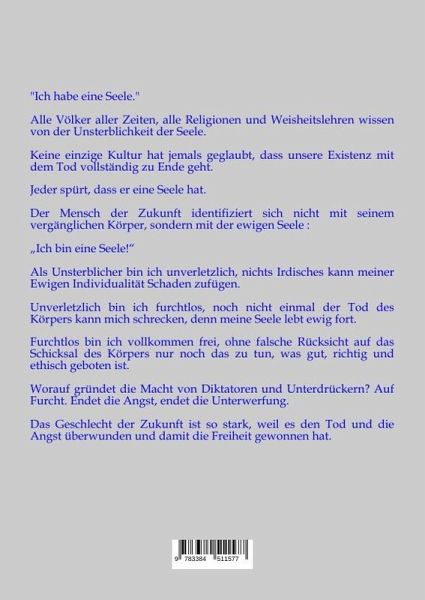Alle Völker aller Zeiten, alle Religionen und Weisheitslehren wussten von der Unsterblichkeit der Seele. Keine einzige Kultur hat jemals geglaubt, dass unsere Existenz mit dem Tod vollständig zu Ende geht.Der Mensch kann auch spüren, dass er eine Seele hat.Es ist vernünftig, sich nicht mit seinem vergänglichen Körper, sondern mit der ewigen Seele zu identifizieren:"Ich bin eine Seele!"Unsterblich und unverletzlich, damit unbesiegbar, also furchtlos und vollkommen frei.