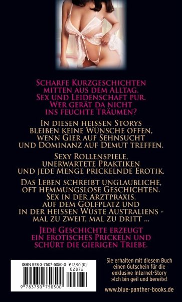 Scharfe Kurzgeschichten mitten aus dem Alltag.Sex und Leidenschaft pur.Wer gerät da nicht ins feuchte Träumen?In diesen heißen Storys bleiben keine Wünsche offen, wenn Gier auf Sehnsucht und Dominanz auf Demut treffen. Sexy Rollenspiele, unerwartete Praktiken und jede Menge prickelnde Erotik. Das Leben schreibt unglaubliche, oft hemmungslose Geschichten. Sex in der Arztpraxis, auf dem Golfplatz und in der heißen Wüste Australiens - mal zu zweit, mal zu dritt ...Jede Geschichte erzeugt ein erotisches Prickeln und schürt die gierigen Triebe.Diese Ausgabe ist vollständig, unzensiert und enthält keine gekürzten erotischen Szenen.