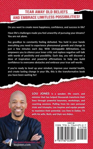 Readers of affirmations books and positive quote books like10,000+ Positive Affirmations, A Year of Positive Thinking, or Badass Affirmations will love the inspirational quotes in Unstoppable Affirmations. Full of inspiration and positive self-talk affirmations, this growth-mindset book is the perfect empowerment gift for you and others. Do you want to create more happiness, confidence, and success in life? Have life's challenges made you feel unworthy of pursuing your dreams? You are not alone. Say goodbye to constantly feeling defeated. You hold in your hands everything you need to experience phenomenal growth and change in just a few minutes each day. With Unstoppable Affirmations, Lou empowers you to silence your inner critic and replace negative self-talk with words of positivity and possibility. Each day, you will discover a dose of inspiration and powerful affirmations to help you build confidence to overcome obstacles and embrace your true self-worth. If you're ready to level up your mindset, improve your mental health, and create lasting change in your life, this is the transformative book you have been waiting for! Perfect for readers of Soundtracks by Jon Acuff, Success Affirmations by Jack Canfield, or listeners of The Secret to Success Podcast. On the professional side, if you liked Words that Change Minds by Shelle Rose Charvet, you'll love Unstoppable Affirmations.