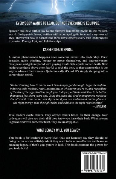 EVERYBODY WANTS TO LEAD, BUT NOT EVERYONE IS EQUIPPED. Speaker and now author Jay Kuhns shatters leadership myths in the modern world. Unstoppable Power, written with an unapologetic tone and easy-to-read style, shows you how to harness the three key elements every true leader needs to master: Energy, Risk, and Relationships. CAREER DEATH SPIRAL A unique phenomenon happens once someone moves into leadership. Their bravado, quick thinking, hunger to prove themselves, and aggressiveness disappear and get replaced with playing it safe. Safe equals career death. New leaders see those above them as fearful to rock the boat, so they assume that is the way to advance their careers. Quite honestly, it's not. It's simply stepping into a career death spiral. "Understanding how to do the work is no longer good enough. Regardless of the industry: tech, medical, retail, hospitality, or whichever you're in, and regardless of the size of the organization; employees today expect their work lives to be better than just a few short years ago. Using the same old, tired management methods doesn't cut it. Your career will skyrocket if you can understand and implement the right energy, take the right risks, and cultivate the right relationships." -JAY KUHNS True leaders excite others. They attract others based on their energy. Your colleagues will give you their all if they know you have their back. When a team is galvanized by authentic trust, they are unstoppable. WHAT LEGACY WILL YOU LEAVE? This book is for leaders at every level who can honestly say they should be doing better or who can selfishly admit they want to be more effective and leave an amazing legacy. If that's you, you're in luck. This book contains the power to help you do both!