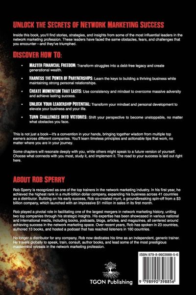 Unstoppable Success: Secrets of Top Earners Your Ultimate Roadmap to Network Marketing Success Network Marketing is more than a business-it's a personal transformation journey. In Unstoppable Success, Rob Sperry brings together real-world wisdom, insights, and strategies from the most accomplished leaders in the industry. This book is your all-access pass to stories, tactics, and lessons from top earners who have mastered the art of resilience, leadership, and growth. From overcoming self-doubt to scaling to six- and seven-figure incomes, the co-authors share actionable strategies and mindset shifts that anyone-from beginner to seasoned professional-can implement. What you'll discover: Battle-Tested Strategies: Learn the habits, routines, and daily income-producing activities (IPAs) that separate the top 1% from everyone else. Mindset Transformation: How to conquer rejection, manage stress, and shift from limiting beliefs to unstoppable confidence. Leadership Insights: Practical advice on building duplicatable systems, recruiting authentically, and inspiring teams to thrive. Real-Life Stories: Relatable journeys of struggle, persistence, and breakthrough success from leaders who started exactly where you are now. With Coach's Notes sprinkled throughout the book, Rob Sperry serves as your personal guide, highlighting key takeaways and urging you to take action. Whether you're looking to kickstart your journey or level up your current results, Unstoppable Success will inspire you to go all-in on your goals, armed with proven tools and strategies. Stop waiting. Start building. Success doesn't happen by accident-it happens through intention and action. Get ready to learn, implement, and achieve your unstoppable success!