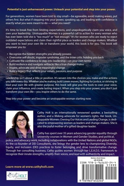Potential is just unharnessed power. Unleash your potential and step into your power. For generations, women have been told to stay small-be agreeable, avoid making waves, put others first. But what if stepping into your power, speaking up, and leading with confidence is exactly what you were meant to do - what you need? It's time to break free from limiting expectations, claim your voice, and own your leadership. Unstoppable Women is a powerful call to action for every woman who has ever been told she is "too much" or "not enough." It's for women who are ready to reject outdated expectations and claim their rightful place as leaders and change-makers. Whether you want to lead your own life or transform your world, this book is for you. This book will empower you to: Recognize the hidden strengths you already possess Overcome self-doubt, imposter syndrome, and the inner critic holding you back Cultivate the confidence to step into leadership-on your own terms Build resilience and navigate setbacks like a true change-maker Inspire, advocate and drive meaningful change Build a legacy that reflects your values, passions, and purpose Leadership isn't about a title or position. It is woven into the choices you make and the actions you take every day. Whether you're making bold career moves, fighting for justice, or striving to lead your own life with greater purpose, this book will give you the tools to own your voice, claim your influence, and create lasting impact. When you step into your power, you don't just transform your own life-you inspire others to do the same.