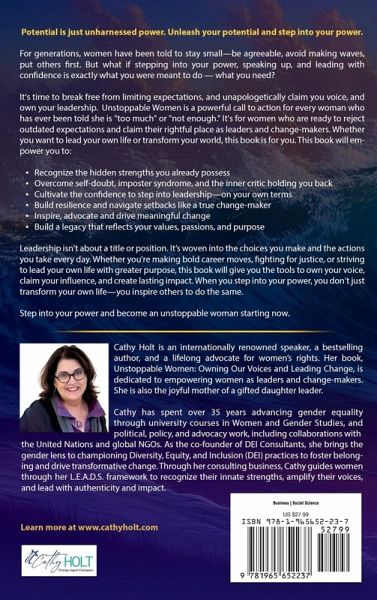 Potential is just unharnessed power. Unleash your potential and step into your power. For generations, women have been told to stay small-be agreeable, avoid making waves, put others first. But what if stepping into your power, speaking up, and leading with confidence is exactly what you were meant to do - what you need? It's time to break free from limiting expectations, claim your voice, and own your leadership. Unstoppable Women is a powerful call to action for every woman who has ever been told she is "too much" or "not enough." It's for women who are ready to reject outdated expectations and claim their rightful place as leaders and change-makers. Whether you want to lead your own life or transform your world, this book is for you. This book will empower you to: Recognize the hidden strengths you already possess Overcome self-doubt, imposter syndrome, and the inner critic holding you back Cultivate the confidence to step into leadership-on your own terms Build resilience and navigate setbacks like a true change-maker Inspire, advocate and drive meaningful change Build a legacy that reflects your values, passions, and purpose Leadership isn't about a title or position. It is woven into the choices you make and the actions you take every day. Whether you're making bold career moves, fighting for justice, or striving to lead your own life with greater purpose, this book will give you the tools to own your voice, claim your influence, and create lasting impact. When you step into your power, you don't just transform your own life-you inspire others to do the same.