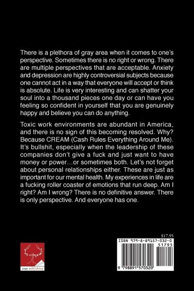 There is a plethora of gray area when it comes to one's perspective. Sometimes there is no right or wrong. There are multiple perspectives that are acceptable. Anxiety and depression are highly controversial subjects because one cannot act in a way that everyone will accept or think is absolute. Life is very interesting and can shatter your soul into a thousand pieces one day or can have you feeling so confident in yourself that you are genuinely happy and believe you can do anything. Toxic work environments are abundant in America, and there is no sign of this becoming resolved. Why? Because CREAM (Cash Rules Everything Around Me). It's bullshit, especially when the leadership of these companies don't give a fuck and just want to have money or power...or sometimes both. Let's not forget about personal relationships either. These are just as important for our mental health. My experiences in life are a fucking roller coaster of emotions that run deep. Am I right? Am I wrong? There is no definitive answer. There is only perspective. And everyone has one.