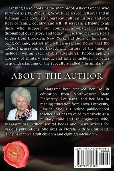 Unsung Hero contains the memoir of Albert Greene who survived as a POW during WWII, served in Korea and in Vietnam. The book is a biography, cultural history, and love story of family, country, and self. It serves as a tribute to all those who support our country in whatever capacity throughout our history and today. These true memories of a soldier from Brooklyn, New York, and those of his family bring courage, patriotism, selflessness, and honor the greatest generation portrayed. The history of the times is included within each of his adventures. Photographs, a glossary of military jargon, and time is included to better help understanding of the subculture called "the military."