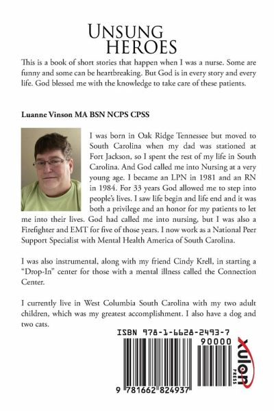 This is a book of short stories that happen when I was a nurse. Some are funny and some can be heartbreaking. But God is in every story and every life. God blessed me with the knowledge to take care of these patients. Luanne Vinson MA BSN NCPS CPSS I was born in Oak Ridge Tennessee but moved to South Carolina when my dad was stationed at Fort Jackson, so I spent the rest of my life in South Carolina. And God called me into Nursing at a very young age. I became an LPN in 1981 and an RN in 1984. For 33 years God allowed me to step into people's lives. I saw life begin and life end and it was both a privilege and an honor for my patients to let me into their lives. God had called me into nursing, but I was also a Firefighter and EMT for five of those years. I now work as a National Peer Support Specialist with Mental Health America of South Carolina. I was also instrumental, along with my friend Cindy Krell, in starting a "Drop-In" center for those with a mental illness called the Connection Center. I currently live in West Columbia South Carolina with my two adult children, which was my greatest accomplishment. I also have a dog and two cats.