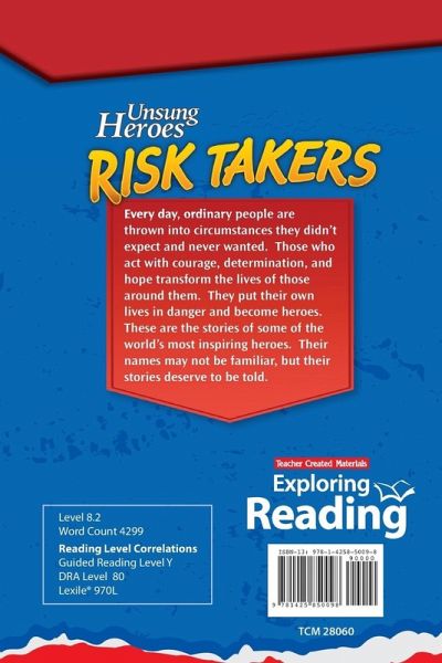 Every day, ordinary people are thrown into circumstances they didn't expect and never wanted. Those who act with courage and determination transform the lives of those around them. They put their own lives in danger and become heroes. Read the inspirational stories of six men, women, and children who took action without concern for their own safety, and be captivated by their bravery! Packed with fun facts and fascinating sidebars, this full-color informational text features high-interest content. With TIME© content and images, this nonfiction book has text features such as a glossary, an index, and a table of contents to engage students in reading as they build their comprehension, vocabulary, and reading skills. The Reader's Guide and extended Try It! activity increase understanding of the material, and develop higher-order thinking. Check It Out! offers print and online resources for additional reading. Keep students reading from cover to cover with this fascinating text!