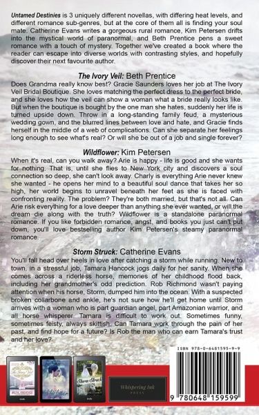 Sometimes, love is inescapable Snuggle up, relax, and prepare to fall in love as you journey through three of the most romantic tales you might ever experience! Untamed Destinies is the brand-new romance anthology from bestselling authors, Beth Prentice, Kim Petersen and Catherine Evans. HEAT LEVELS: The Ivory Veil by BETH PRENTICE ~ Sweet Wildflower by KIM PETERSEN ~ Sexy Storm Struck by CATHERINE EVANS ~ Sweet Untamed Destinies is 3 uniquely different novellas, with differing heat levels, and different genres, but at the core of them all is finding your soul mate. Catherine Evans writes a gorgeous rural romance, Kim Petersen drifts into the mystical world of paranormal, and Beth Prentice pens a sweet romance with a touch of mystery. Together we've created a book where the reader can escape into diverse worlds with contrasting styles, and hopefully discover their next favourite author. The Ivory Veil: Does Grandma really know best? Gracie Saunders loves her job at The Ivory Veil Bridal Boutique. She loves matching the perfect dress to the perfect bride, and she loves how the veil can show a woman what a bride really looks like. But when the boutique is bought by the one man she hates, suddenly her life is turned upside down. Throw in a long-standing family feud, a mysterious wedding gown, and the blurred lines between love and hate, and Gracie finds herself in the middle of a web of complications. Can she separate her feelings long enough to see what's real? Or will she be out of a job and single forever? Wildflower When it's real, can you walk away? Arie is happy - life is good and she wants for nothing. That is, until she flies to New York city and discovers a soul connection so deep, she can't look away. Charly is everything Arie never knew she wanted - he opens her mind to a beautiful soul dance that takes her so high, her world begins to unravel beneath her feet as she is faced with confronting reality. The problem? They're both married, but that's not all. Can Arie risk everything for a love deeper than anything she ever wanted, or will the dream die along with the truth? Wildflower is a standalone paranormal romance. If you like forbidden romance, angst, and books you just can't put down, you'll love bestselling author Kim Petersen's steamy paranormal romance. Storm Struck You'll fall head over heels in love after catching a storm while running. New to town, in a stressful job, Tamara Hancock jogs daily for her sanity. When she comes across a riderless horse, memories of her childhood flood back, including her grandmother's odd prediction. Rob Richmond wasn't paying attention when his horse, Storm, dumped him into the ocean. With a suspected broken collarbone and ankle, he's not sure how he'll get home until Storm arrives with a woman who is part guardian angel, part Amazonian warrior, and all horse whisperer. Tamara is difficult to work out. Sometimes funny, sometimes feisty, always skittish. Can Tamara work through the pain of her past, and find hope for a future? Is Rob the man who can earn Tamar