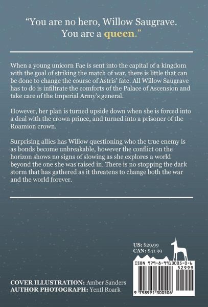 When a young Unicorn Fae is sent into the capital of a kingdom with the goal of striking the match of war, there is little that can be done to change the course of Astris' fate. All Willow Saugrave has to do is infiltrate the comforts of the Palace of Ascension and take care of the Imperial Army's general. However, her plan is turned upside down when she is forced into a deal with the crown prince and turned into a prisoner of the Roamion crown. Surprising allies has Willow questioning who the true enemy is as bonds become unbreakable, however the conflict on the horizon shows no signs of slowing as she explores a world beyond the one she was raised in. There is no stopping the dark storm that has gathered as it threatens to change both the war and the world forever.