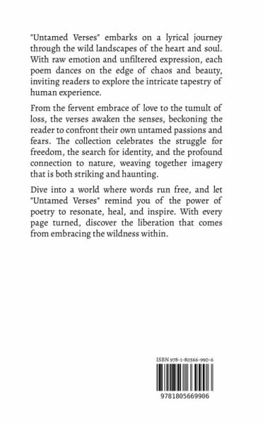 "Untamed Verses" embarks on a lyrical journey through the wild landscapes of the heart and soul. With raw emotion and unfiltered expression, each poem dances on the edge of chaos and beauty, inviting readers to explore the intricate tapestry of human experience. From the fervent embrace of love to the tumult of loss, the verses awaken the senses, beckoning the reader to confront their own untamed passions and fears. The collection celebrates the struggle for freedom, the search for identity, and the profound connection to nature, weaving together imagery that is both striking and haunting. Dive into a world where words run free, and let "Untamed Verses" remind you of the power of poetry to resonate, heal, and inspire. With every page turned, discover the liberation that comes from embracing the wildness within.