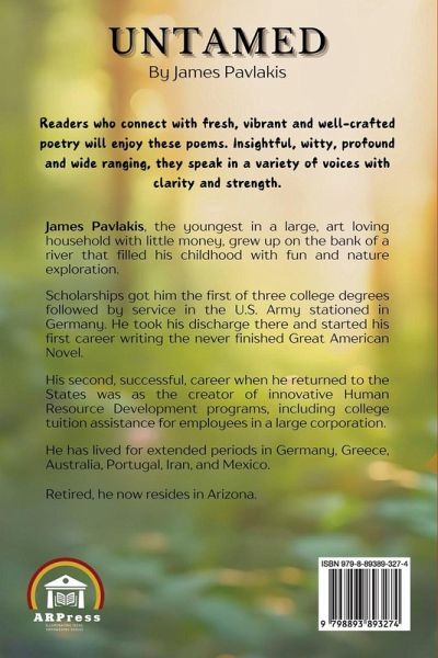 James Pavlakis, the youngest in a large, art loving household with little money, grew up on the bank of a river that filled his childhood with fun and nature exploration.Scholarships got him the first of three college degrees followed by service in the U.S. Army stationed in Germany. He took his discharge there and started his first career writing the never finished Great American Novel.His second, successful, career when he returned to the States was as the creator of innovative Human Resource Development programs, including college tuition assistance for employees in a large corporation.He has lived for extended periods in Germany, Greece, Australia, Portugal, Iran, and Mexico.Retired, he now resides in Arizona.