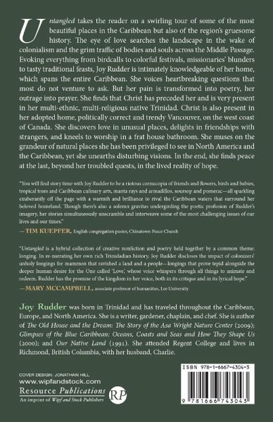 Untangled takes the reader on a swirling tour of some of the most beautiful places in the Caribbean but also of the region's gruesome history. The eye of love searches the landscape in the wake of colonialism and the grim traffic of bodies and souls across the Middle Passage. Evoking everything from birdcalls to colorful festivals, missionaries' blunders to tasty traditional feasts, Joy Rudder is intimately knowledgeable of her home, which spans the entire Caribbean. She voices heartbreaking questions that most do not venture to ask. But her pain is transformed into poetry, her outrage into prayer. She finds that Christ has preceded her and is very present in her multi-ethnic, multi-religious native Trinidad. Christ is also present in her adopted home, politically correct and trendy Vancouver, on the west coast of Canada. She discovers love in unusual places, delights in friendships with strangers, and kneels to worship in a frat house bathroom. She muses on the grandeur of natural places she has been privileged to see in North America and the Caribbean, yet she unearths disturbing visions. In the end, she finds peace at the last, beyond her troubled quests, in the lived reality of hope.
