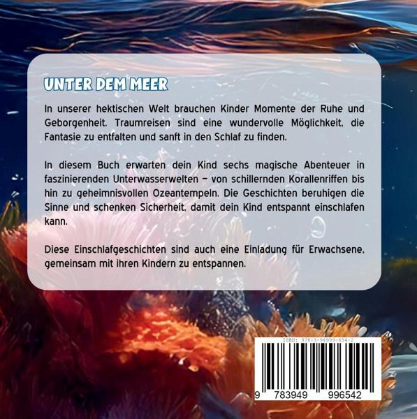 Sanfte Geschichten für kleine Seelen - jetzt in überarbeiteter AuflageIn einer Welt voller Hektik und Reizüberflutung brauchen Kinder Momente der Ruhe, Geborgenheit und inneren Balance. Dieses Buch lädt Kinder im Alter von ca. 5-10 Jahren ein, zur Ruhe zu kommen, ihre Fantasie zu entfalten - und sich unbewusst Techniken der Entspannung anzueignen. Traumreisen für mehr innere RuheSechs sanfte Geschichten führen durch faszinierende Unterwasserwelten - von bunten Korallenriffen bis zu geheimnisvollen Ozeantempeln. Mit einem bewusst wiederkehrenden Einstieg und Ausklang schaffen sie einen meditativen Rahmen, der Sicherheit gibt und das Einschlafen erleichtert. Wertvolle Rituale fürs FamilienlebenDie Geschichten eignen sich perfekt zum Vorlesen am Abend, zum gemeinsamen Kuscheln oder für bewusste Ruhepausen zwischendurch. Positive Affirmationen und beruhigende Bilder unterstützen Kinder dabei, innere Ruhe zu entwickeln - ganz ohne Druck, ohne Regeln, ohne Zwang. Jetzt in neuer AuflageDie 2. Auflage erscheint in einem leicht größeren Format (8,5 x 8,5") mit optimierter Schriftgestaltung für bessere Lesbarkeit - ideal für gemütliche Vorlese-Momente.