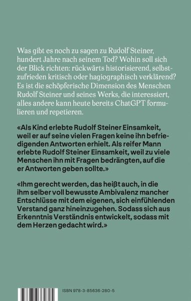Was gibt es noch zu sagen zum 100. Todestag Rudolf Steiners? Wohin kann sich der Blick richten, rückwärts historisierend, selbstzufrieden kritisch, ja blasphemisch oder hagiographisch verklärend? Andreas Laudert geht in seinem Buch über Steiner in sich, steht mit dem Standbein in der Gegenwart und erkundet mit dem Spielbein Vergangenheit und Zukunft. Als Schriftsteller und Dichter genügen ihm die historischen Aspekte nicht, langweilt ihn das Alt-Bekannte sowohl der Kritik als auch der Verehrung.Er fasst sich ein Herz und nimmt sich des Themas persönlich an. Was bleibt von Steiners Werk und Biographie, das immer noch zukünftiges, unausgeschöpftes Potential hat? Diese schöpferische Dimension des Menschen Rudolf Steiner und seines Werkes interessiert ihn, alles andere kann heute bereits Chatgpt formulieren und wiederholen. So entsteht ein Text, der im Prozesshaften bleibt und den Kern von Steiners Werk spiegelt, das Unabgeschlossene, ständig sich Erneuernde und Erweiternde, manchmal auch scheinbar Widersprüchliche. Ein inneres Gespräch.