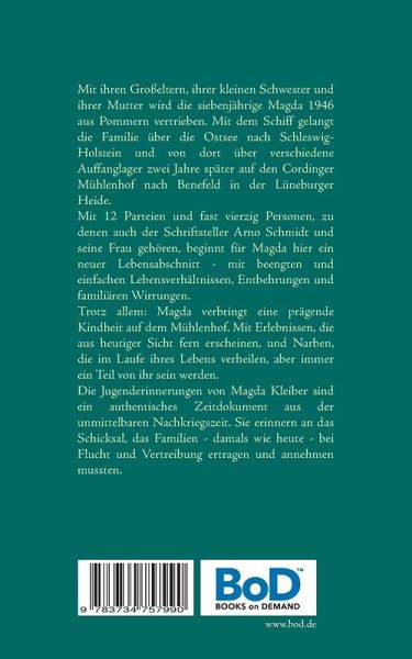 Mit ihren Großeltern, ihrer kleinen Schwester und ihrer Mutter wird die siebenjährige Magda 1946 aus Pommern vertrieben. Mit dem Schiff gelangt die Familie über die Ostsee nach Schleswig-Holstein und von dort über verschiedene Auffanglager zwei Jahre später auf den Cordinger Mühlenhof nach Benefeld in der Lüneburger Heide.Mit 12 Parteien und fast vierzig Personen, zu denen auch der Schriftsteller Arno Schmidt und seine Frau gehören, beginnt für Magda hier ein neuer Lebensabschnitt - mit beengten und einfachen Lebensverhältnissen, Entbehrungen und familiären Wirrungen.Trotz allem: Magda verbringt eine prägende Kindheit auf dem Mühlenhof. Mit Erlebnissen, die aus heutiger Sicht fern erscheinen, und Narben, die im Laufe ihres Lebens verheilen, aber immer ein Teil von ihr sein werden.Die Jugenderinnerungen von Magda Kleiber sind ein authentisches Zeitdokument aus der unmittelbaren Nachkriegszeit. Sie erinnern an das Schicksal, das Familien - damals wie heute - bei Flucht und Vertreibung ertragen und annehmen mussten.