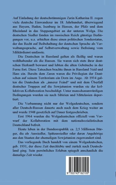 Auf Einladung der deutschstämmigen Zarin Katharina II. zogen viele deutsche Einwanderer im 18.Jahrhundert in das Steppengebiet an der Wolga.Das vorliegende Buch handelt von einem Wolgadeutschen geb. 1931, der seine Kindheit an der Wolga verbrachte. Erlebte die Zeit als die Deutschen an der Wolga mit dem Überfall deutscher Truppen auf die Sowjetunion als "innerer Feind" betrachtet wurden. Unter menschenunwürdigen Bedingungen erfolgte die Deportation nach Sibieren bzw. Mittelasien.Die Verbannung nicht nur der Wogadeutschen, sondern aller Deutsch-Russen dauerte auch nach dem Krieg weiter an.Erst 1964 wurden die Wolgadeutschen offiziell vom Vorwurf der Kollaboration mit dem nationalsozialistischen Deutschland befreit.Heute leben in der Bundesrepublik ca. 2,5 Millionen Bürger, die als Aussiedler, Spätaussiedler oder deren Angehörige aus den Staaten der ehemaligen Sowjetunion zugewandert sind.Das persönliche Erleben der Hauptperson dieses Buches von seiner Geburt bis zur Übersiedlung in die Bundesrepublik spiegelt anschaulich die damalige Zeit wieder.