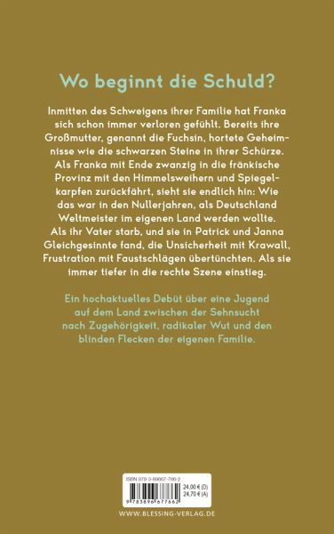 Inmitten des Schweigens ihrer Familie hat Franka sich schon immer verloren gefühlt. Bereits ihre Großmutter, genannt die Fuchsin, hortete Geheimnisse wie die schwarzen Steine in ihrer Schürze. Als Franka mit Ende Zwanzig in die fränkische Provinz mit den Himmelsweihern und Spiegelkarpfen zurückfährt, sieht sie endlich hin: Wie das war in den Nullerjahren, als Deutschland Weltmeister im eigenen Land werden wollte. Als ihr Vater starb und sie in Patrick und Janna Gleichgesinnte fand, die Unsicherheit mit Krawall, Frustration mit Faustschlägen übertünchten. Als sie immer tiefer in die rechte Szene einstieg. Sie beginnt Fragen zu stellen und sucht nach einer Haltung zur Vergangenheit.