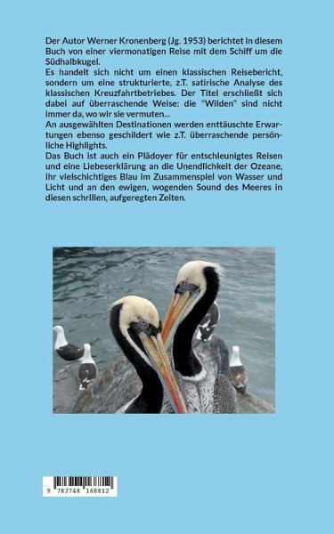 Der Autor Werner Kronenberg (Jg. 1953) berichtet in diesem Buch von einer viermonatigen Reise mit dem Schiff um die Südhalbkugel.Es handelt sich nicht um einen klassischen Reisebericht, sondern um eine strukturierte, z.T. satirische Analyse des klassischen Kreuzfahrtbetriebes. Der Titel erschließt sich dabei auf überraschende Weise: die "Wilden" sind nicht immer da, wo wir sie vermuten...An ausgewählten Destinationen werden enttäuschte Erwartungen ebenso geschildert wie z.T. überraschende persönliche Highlights.Das Buch ist auch ein Plädoyer für entschleunigtes Reisen und eine Liebeserklärung an die Unendlichkeit der Ozeane, ihr vielschichtiges Blau im Zusammenspiel von Wasser und Licht und an den ewigen, wogenden Sound des Meeres in diesen schrillen, aufgeregten Zeiten.