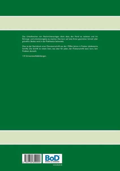 Das Unterbrechen von Nachrichtenanlagen dient dazu, den Feind zu isolieren und ihn führungs- und orientierungslos zu machen. Das kann auf zwei Arten geschehen: Schnell oder gründlich. Beides wird in der Publikation behandelt.Dies ist der Nachdruck einer Dienstvorschrift aus den 1930er Jahren in Fraktur (altdeutsche Schrift). Die Schrift ist relativ klein, was aber für jeden, der Frakturschrift lesen kann, kein Problem darstellt.110 Schwarzweißabbildungen.