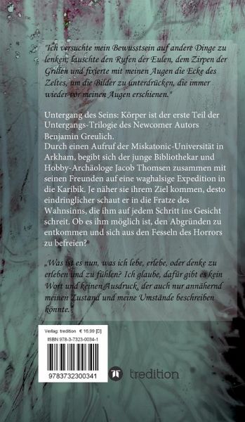 Nach seinem Abitur an einem beruflichen Gymnasium, begann Benjamin Greulich, geboren am 13.10.1989, Rechtswissenschaften an der Leuphana Universität Lüneburg zu studieren. Schon früh begann ihn das Übernatürliche und Mystische zu faszinieren, wodurch er schnell auf Autoren wie H.P.Lovecraft aufmerksam wurde, bis er eines Tages den Entschluss fasste, selbst als Schriftsteller aktiv zu werden. Nach vielen Gedichten und Kurzgeschichten wurde das erste größere Projekt in Angriff genommen. Der "Untergang des Seins" entstand. Der erste Teil, "Körper", erblickte nun das Licht, während "Geist" und "Seele" noch im Dunkeln schlummernd auf den Tag warten, aus dem Meer aller Möglichkeiten hervorzutreten und den Wahnsinn erneut entfachen zu lassen.