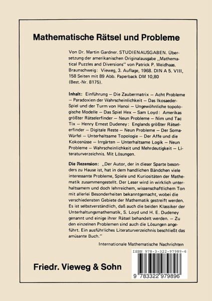 Die Freude am Mathematismen hat viele Quellen: sie entspringt dem Wunsm nam Unterhaltung und dem Interesse an spannenden Problemen, kniffligen Smlußfolgerungen und überrasmenden Lösungen. Hier ist eine Auswahl an meist neueren Fragestellungen getroffen, von denen einige bisher in Famzeitsmriften ein weniger beamtetes Dasein führen oder nur in mündlimer überlieferung existieren; sie alle können der Unter haltungsmathematik zugeremnet werden und verdienen daher bekannter zu werden. Die Voraussetzungen zum Verständnis der Antworten be smränken sim im allgemeinen auf das Smulwissen. Mein besonderer Dank gilt Herrn Prof. Herbert Mesdtkowski, der diesen Versum ermutigte und die Verbindung mit dem Verlage herstellte. Allge meiner Dank gebührt den am Smluß genannten Autoren, auf deren Arbeiten diese Smrift großenteils beruht. Berlin, im Juni 1961 Roland Sprague Aufgaben Seite o Gesucht: Zentrale 3 Wirre Drähte . . . . . . . . . . . . . . . . . . . . . . . . . . . . . . . . . . . . . . . . . . . . 3 e Schwere Kisten . . . . . . . . . . . . . . . . . . . . . . . . . . . . . . . . . . . . . . . . . . . 3 e Ein Spiel mit vier Zahlen . . . . . . . . . . . . . . . . . . . . . . . . . . . . . . . . . . 4 o Von Ziffernsystemen und Palindromen . . . . . . . . . . . . . . . . . . . . . . 5 e Rangier-Manöver . . . . . . . . . . . . . . . . . . . . . . . . . . . . . . . . . . . . . . . . 6 o f) Rot oder schwarz . . . . . . . . . . . . . . . . . . . . . . . . . . . . . . . . . . . . . . . . . 7 (!) Das Problem der 12 Münzen . . . . . . . . . . . . . . . . . . . . . . . . . . . . . . 8 f) Ein Problem mit 13 Münzen . . . . . . . . . . . . . . . . . . . . . . . . . . . . . . 8 tri) Nim . . . . . . . . . . . . . . . . . . . . . . . . . . . . . . . . . . . . . . . . . . . . . . . . . . . . 8 ~ Eine Eigenschaft der Zahl V:Z . . . . . . . . . . . . . . . . . . . . . . . . . . . . . . 10 48 Ein sonderbarer Tunnel . . . . . . . . . . . . . . . . . . . . . . . . . . . . . . . . . . . .11 e Auslosung zum Skat-Turnier . . . . . . . . . . . . . . . . . . . . . . . . . . . . . . 11 4D Die wandernden Steine . . . . . . . . . . . . . . . . . . . . . . . . . . . . . . . . . . . . 11 e Eine Zerlegungsaufgabe . . . . . . . . . . . . . . . . . . . . . . . . . . . . . . . . . . . 13 C Zwei Tafelrunden . . . . . . . . . . . . . . . . . . . . . . . . . . . . . . . . . . . . . . . . 14 . . Pakete von Streichholzschachteln . . . . . . . . . . . . . . . . . . . . . . . . . . . . 14 e Ein Gewichtssatz von Laputa . . . . . . . . . . . . . . . . . . . . . . . . . . . . . . . 14 C) Ein besonderes Münzsystem . . . . . . . . . . . . . . . . . . . . . . . . . . . . . . " 15 e Bücherpreise . . . . . . . . . . . . . . . . . . . . . . . . . . . . . . . . . . . . . . . . . . . . . 15 tD "Abgekürzte" Division . . . . . . . . . . . . . . . . . . . . . . . . . . . . . . . . . . . . 15 ~ Ein noch ungelöstes Problem . . . . . . . . . . . . . . . . . . . . . . . . . . . . . . . 16 G) Eine Laskersche Abart von Nim . . . . . . . . . . . . . . . . . . . . . . . . . . . . 16 G) "Ungerade" gewinnt . . . . . . . . . . . . . . . . . . . . . . . . . . . . . . . . . . . . . . 16 ~ Eine diophantische Frage . . . . . . . . . . . . . . . . . . . . . . . . . . . . . . . . . . .