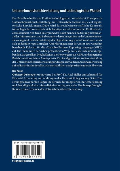 Der Band beschreibt den Einfluss technologischen Wandels auf Konzepte zur Unternehmensberichterstattung, auf Unternehmensebene sowie auf regulatorische Entwicklungen. Dabei wird das sozialwissenschaftliche Konstrukt technologischen Wandels als vielschichtiger sozioökonomischer Einflussfaktor charakterisiert. Vor dem Hintergrund der zunehmenden Bedeutung nichtfinanzieller Informationen und insbesondere deren Integration in die Unternehmenssteuerung und -berichterstattung, der Digitalisierung von Informationen sowie sich ändernder regulatorischer Anforderungen zeigt der Autor eine weiterhin bestehende Relevanz für die eXtensible Business Reporting Language (XBRL) auf. Die im Rahmen der Arbeit präsentierten Wege sowie die sich hieraus ergebenden, dargestellten Möglichkeiten der Konvergenz aus XBRL und integrierter Berichterstattung liefern Ansatzpunkte für eine digitalisierte Weiterentwicklung der Unternehmensberichterstattung und regen zur weiteren Auseinandersetzung auf politisch-institutioneller, wissenschaftlicher und praxisorientierter Ebene an.