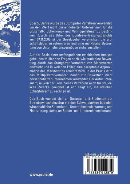 Auf der Basis einer umfangreichen empirischen Analyse geht Jens Müller den Fragen nach, wie stark eine Bewertung durch das Stuttgarter Verfahren von Marktwerten abweicht und in welchen Fällen eine akzeptable Approximation des Marktwertes erreicht wird. In der Praxis wird das Multiplikatorverfahren häufig zur Bewertung nicht börsennotierter Unternehmen verwendet. Der Autor untersucht, in welcher Form dieses Verfahren auch für steuerliche Zwecke geeignet ist und zeigt auf, mit welchen Schätzfehlern zu rechnen ist.