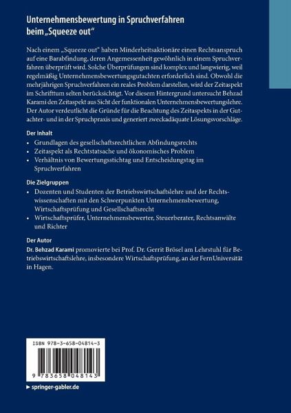 Nach einem "Squeeze out" haben Minderheitsaktionäre einen Rechtsanspruch auf eine Barabfindung, deren Angemessenheit gewöhnlich in einem Spruchverfahren überprüft wird. Solche Überprüfungen sind komplex und langwierig, weil regelmäßig Unternehmensbewertungsgutachten erforderlich sind. Obwohl die mehrjährigen Spruchverfahren ein reales Problem darstellen, wird der Zeitaspekt im Schrifttum selten berücksichtigt. Vor diesem Hintergrund untersucht Behzad Karami den Zeitaspekt aus Sicht der funktionalen Unternehmensbewertungslehre. Der Autor verdeutlicht die Gründe für die Beachtung des Zeitaspekts in der Gutachter- und in der Spruchpraxis und generiert zweckadäquate Lösungsvorschläge.