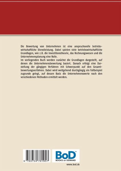 Die Bewertung von Unternehmen ist eine anspruchsvolle betriebswirtschaftliche Dienstleistung. Dabei spielen viele betriebswirtschaftliche Grundlagen, wie z.B. die Investitionstheorie, das Rechnungswesen und die Unternehmensplanung eine Rolle.Im vorliegenden Buch werden zunächst die Grundlagen dargestellt, auf denen die Unternehmensbewertung basiert. Ausgehend von Anlässen und Funktionen der Unternehmensbewertung wird nach einem kurzen Überblick über die gängigen Verfahren auf die finanzwirtschaftlichen Grundlagen und den Jahresabschluss eingegangen.Danach erfolgt eine Darstellung der gängigen Verfahren mit Schwerpunkt auf den Gesamtbewertungsverfahren. Dabei wird weitgehend durchgängig ein Fallbeispiel zugrunde gelegt, auf dessen Basis die Unternehmenswerte nach den verschiedenen Methoden ermittelt werden.