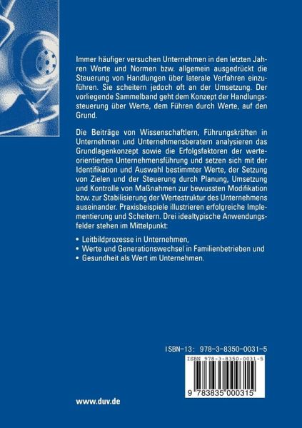 Inhaltverzeichnis.- A: Werteorientierte Unternehmensführung - Eine Einführung.- I. Werteorientierte Unternehmensführung - Das Konzept.- II.Messung von Werten - Eine Fallstudie.- B: Leitbildprozesse als Möglichkeit Werteorientierter Unternehmensführung.- III. The spirit of values - Leitorientierungen für Führungskräfte und Mitarbeiter.- IV.Leitbildentwicklung - ein schöpferischer Prozess.- V. Werteorientierte Führung an einem Universitätsinstitut- Eine kritische Betrachtung des Konzeptes und seiner Implementierung.- VI. Kulturbericht der Firma Planet Value.- C: Werteorientierung in der Unternehmensnachfolge.- VII. Werteungleichgewichte in der Unternehmensnachfolge - Ein Diagnosemodell für kleine und mittlere Familienunternehmen.- VIII. Nachfolger gesucht - Generationswechsel in Familienunternehmen. Nachfolgeberatung aus Sichteines Wirtschaftstrainers und Mediators.- D: Gesundheit als Wert im Unternehmen.- IX. Betriebliches Gesundheitsmanagement - Konzepte, Qualitätskriterien und Effekte.- X. Gesundheit als organisationaler Wert - Betriebliches Gesundheits management als Brücke zwischen betriebswirtschaftlichen Zielen und individuellen Werten.- Xl. Das Spannungsfeld zwischen betriebswirtschaftlichen Zielen und organisationalen Werten - Beispiel des Programms LIFE der voestalpine AG.- XII. ...weil der Mensch eben keine triviale Maschine ist ... Der Wert Gesundheit im Blickpunkt.- E: Autorlnnenverzeichnis.