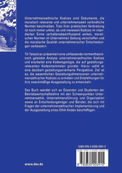Till Talaulicar präsentiert eine umfassende normentheoretisch geleitete Analyse unternehmensethischer Kodizes und erarbeitet eine Kodextypologie, die auf gestaltungsrelevanten Kodexmerkmalen gründet. Hierzu wählt er eine dezidiert gestaltungsorientierte Perspektive. Ziel ist es, die wesentlichen Gestaltungsdimensionen unternehmensethischer Kodizes zu ermitteln und Empfehlungen für ihre zweckmäßige Ausgestaltung zu entwickeln.