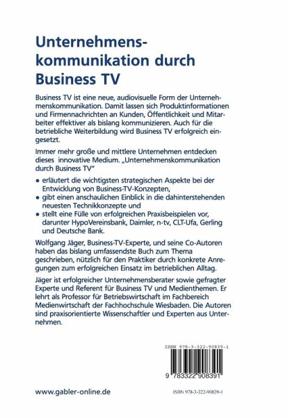 Schon morgen wird BUSINESS TV als Informationsträger für Weiterbildung sowie interne und externe Öffentlichkeitsarbeit nicht mehr wegzudenken sein. Dieses erste umfassende Buch zum Thema zeigt, wie Unternehmen BUSINESS TV-Konzepte erfolgreich entwickeln und umsetzen können. Mit Erfahrungsberichten von Praktikern.